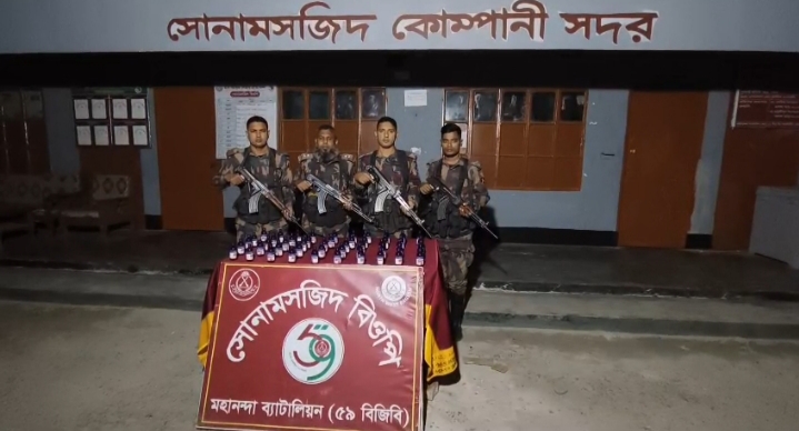 সোনামসজিদ সীমান্তে ৫৯ বিজিবির অভিযানে ৫০ বোতল ভারতীয় স্কাপ সিরাপ আটক
